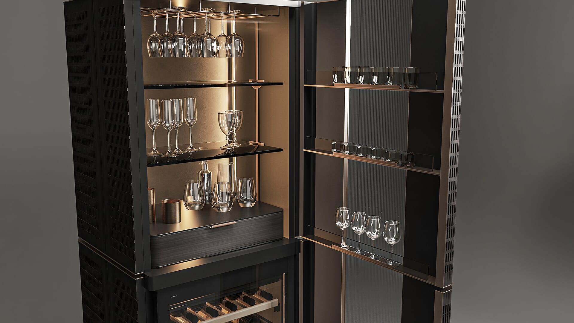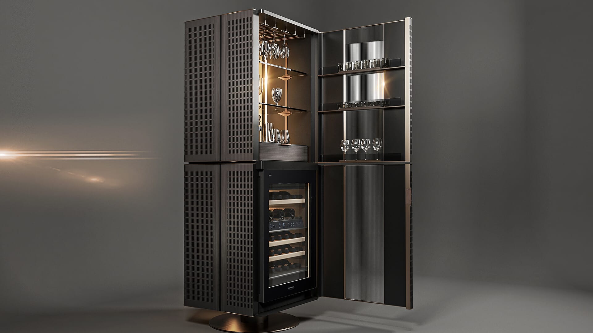 Den roterende sentrale basen i polert messing støtter en struktur som egner seg til tilpasning takket være et utvalg av ulike finisher, fra tre til skinn, som omslutter et mikroribbet glasspanel. Innvendig rommer det en øvre «forfengelighet»-sone med hyller og en raffinert liten skuff, hvor du kan oppbevare glass, vin- og champagnepropper, korketrekkere og flaskeåpnere, karafler og karafler.