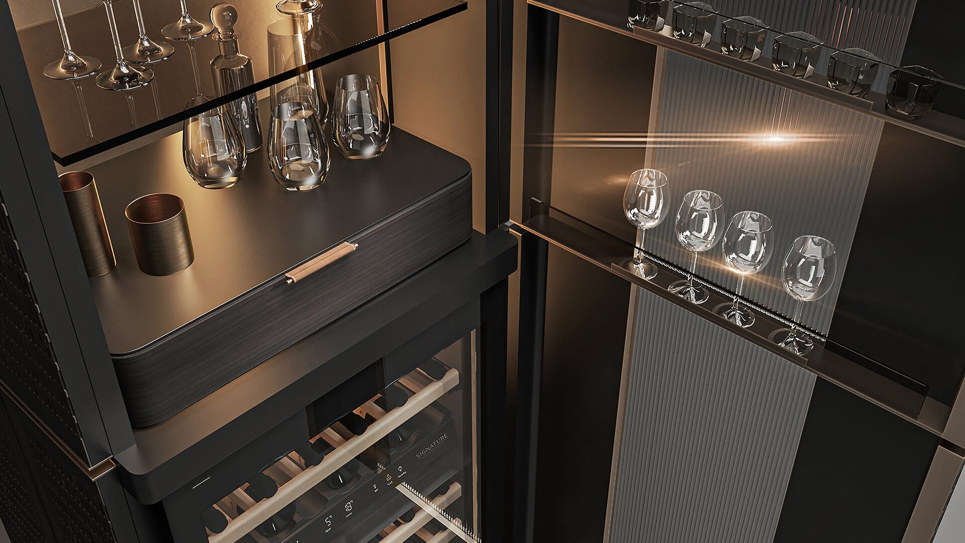 S K I N S er vinkabinettet designet av m2atelier for å fungere som et edelt kabinett for vinskap fra Signature Kitchen Suite. Estetikk møter urbane forslag og